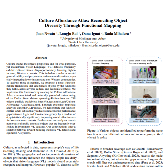 Culture Affordance Atlas: Reconciling Object Diversity Through Functional Mapping will be presented at AAAI 2026. See you at Changi, Singapore! This is work is a nice follow up on the 'Bridging the Digital Divide paper and Uplifting Lower Income Data'. Check it out!